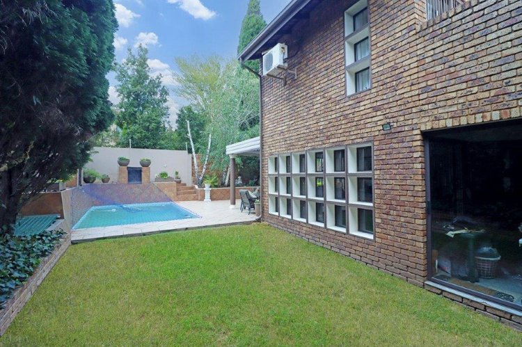 Modern and low-maintenance aluminum windows and doors are installed throughout, with custom blinds and curtains included as part of the fixtures. The outdoor area is designed for family enjoyment, featuring a beautifully maintained pool with a water feature.