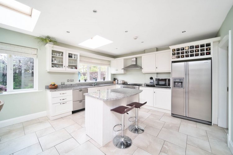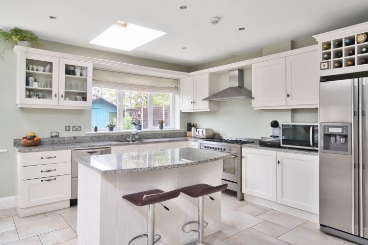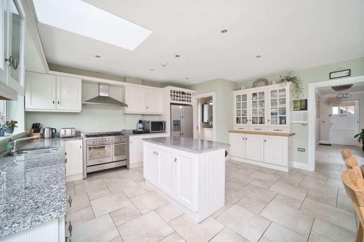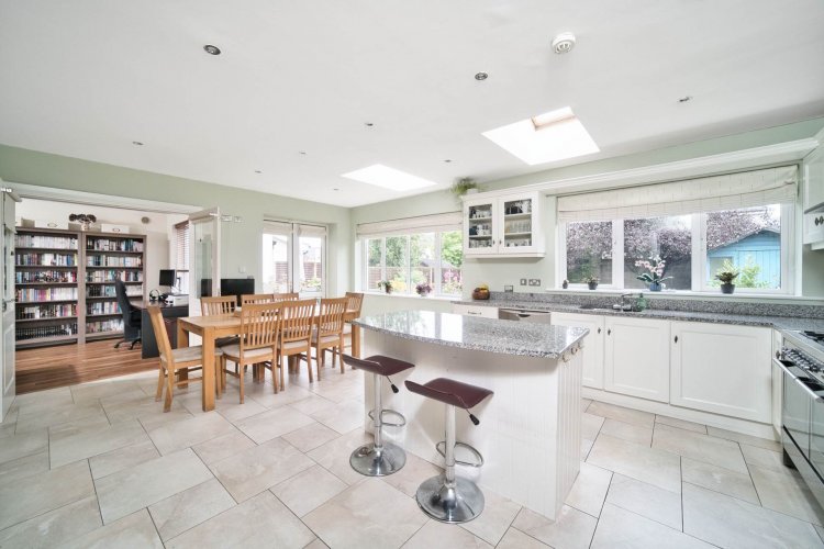 Kitchen/ Dining 5.21m x 6.49m Tiled floor, fully fitted soft close kitchen, island with seating area, granite worktops, Waterford gas double-oven range cooker and hob, extractor fan, down lights, two skylights, generous dining area, access to rear garden.