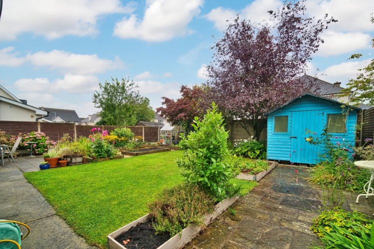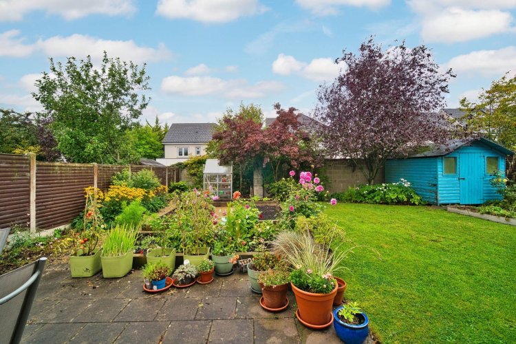 Garden Beautifully landscaped rear garden featuring a spacious patio area, manicured lawn, and raised beds tastefully planted with a mix of flowers, herbs, and vegetables. The space is fully enclosed with mature shrubs, trees, concrete post and panel fencing with walled surround for added privacy, outdoor tap and access to both sides of the property.