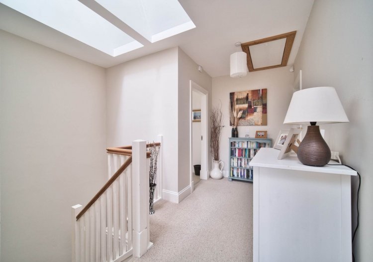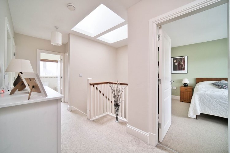 Landing 4.80m x 1.30m Fully carpeted including stairs, hot-press, access to attic, two skylights.