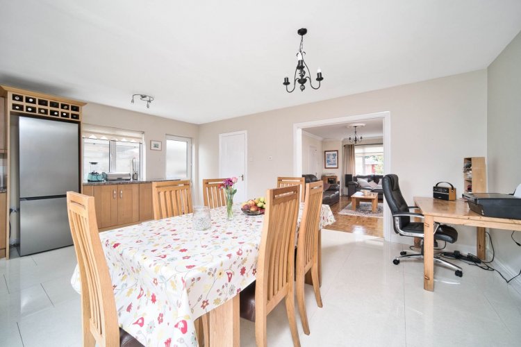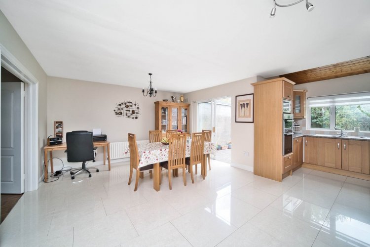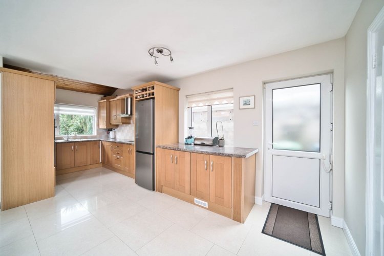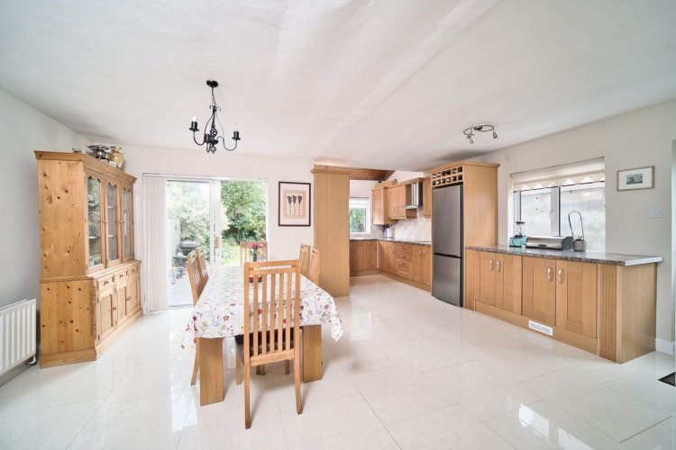 Kitchen/Dining 6.53m x 5.88m x 4.26m L-shaped, tiled floor, fully fitted kitchen with additional worktop space, integrated oven and grill, electric hob, extractor fan, microwave, integrated dishwasher, stainless steel sink, fridge freezer, wine rack, pine clad panelling on ceiling, spot lights, ample dining area. Door access to side entrance & sliding doors leading to sunny patio area and garden.