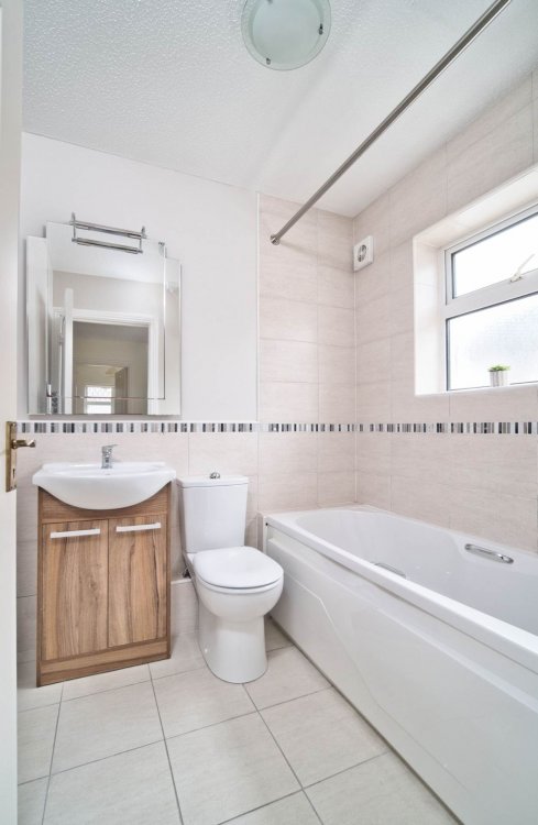 Bathroom 1.77m x 2.00m Tiled floor, semi-tiled wall, decorative border, bath, electric shower, w.c., w.h.b., fitted cabinet, mirror, fitted light.
