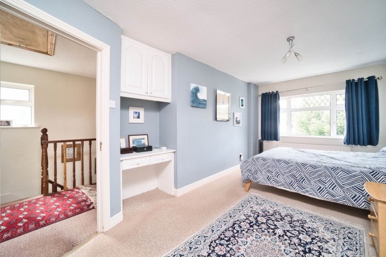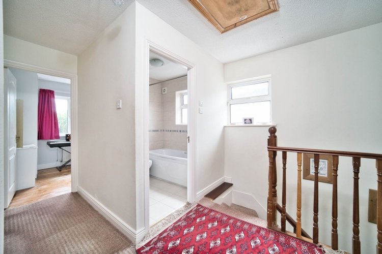 Landing 3.14m x 2.53m Carpeted including stairs, access hatch to attic.