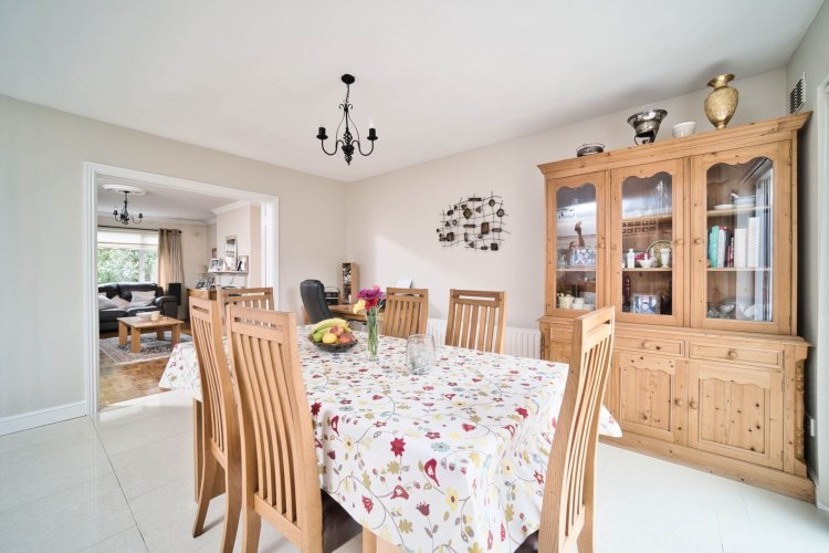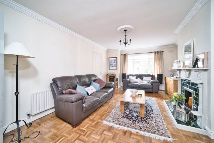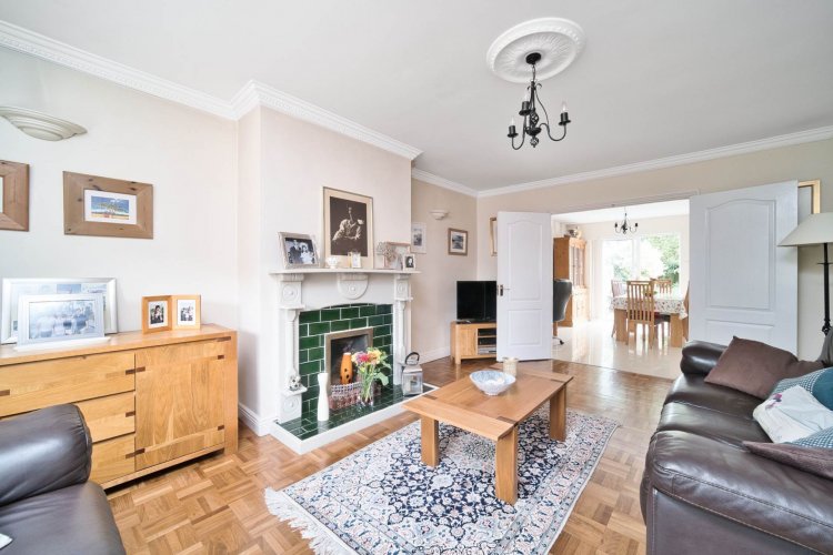 Living Room 3.76m x 5.81m Parquet flooring, feature solid fuel fireplace with wood mantlepiece, TV point, decorative coving and cornice, double doors leading to kitchen/dining area.