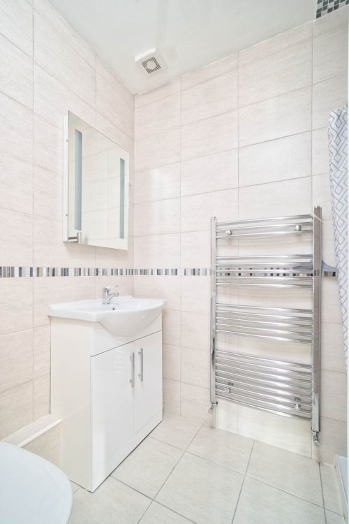En-suite 1.58m x 1.16m Fully tiled, shower enclosure, w.c., w.h.b. with vanity unit, fitted LED mirror, towel radiator.