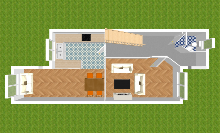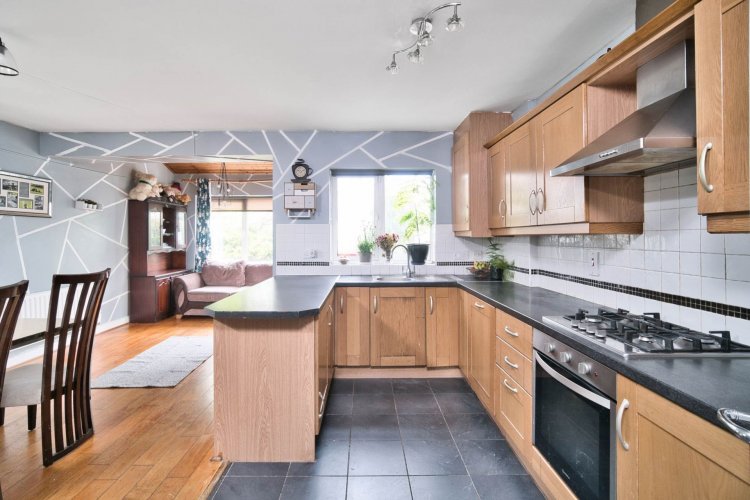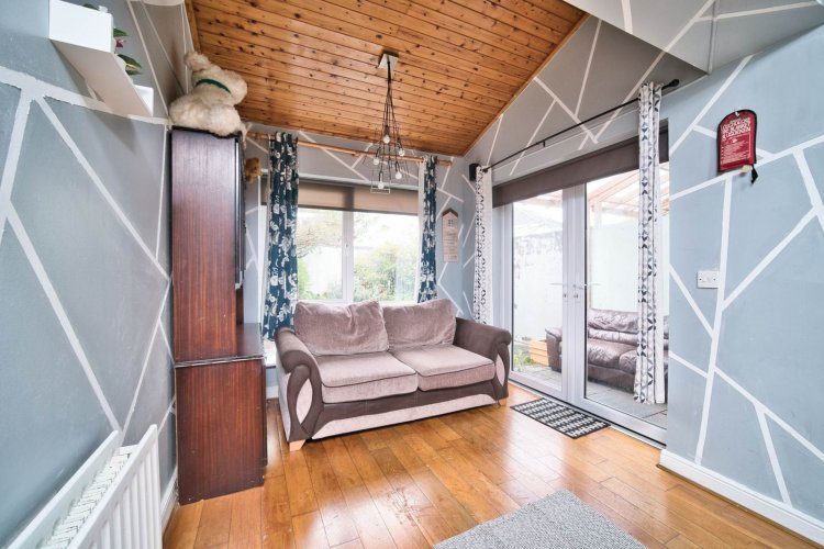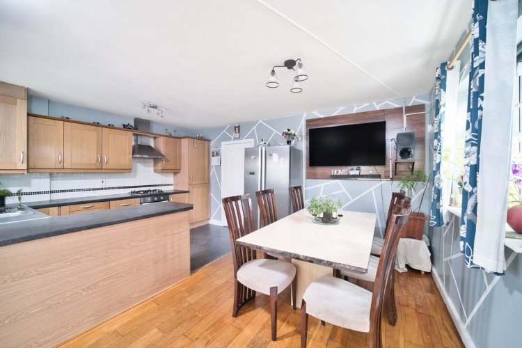 Kitchen/Dining (4.96m x 3.81m) + (2.75m x 2.55m) Tiled in kitchen area and oak flooring in living/dining area, shaker style fitted wall and floor units, integrated oven, gas hob, extractor hood, integrated dishwasher, 3 light fittings, curtains, Gas boiler, stainless steel sink, window and double doors leading out to rear garden.