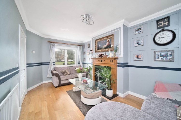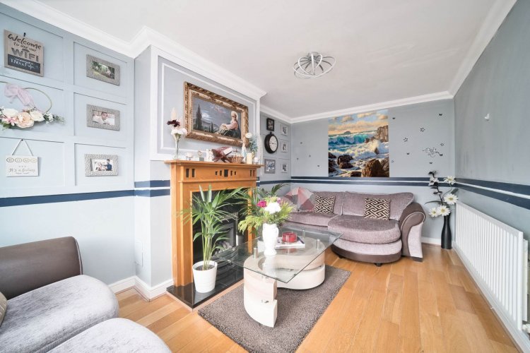 Living Room 2.93m x 4.85m Oak flooring, coving, panelled wall, fireplace with gas fire insert, curtains, blinds and light fitting.