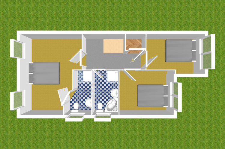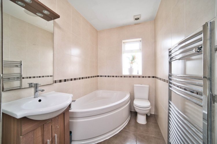 Bathroom 3m x 1.65m Fully tiled, corner bath, shower cubicle, w.c., w.h.b. with built in vanity unit, fitted mirror with lighting and heated towel rail.