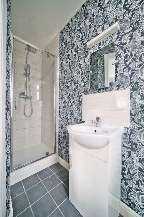 Ensuite 1.24m x 2.92m Tiled flooring, semi tiled wall and fully tiled around shower cubicle with monsoon shower head, w.c., w.h.b. with built in vanity unit, mirror, light fitting and extractor fan.