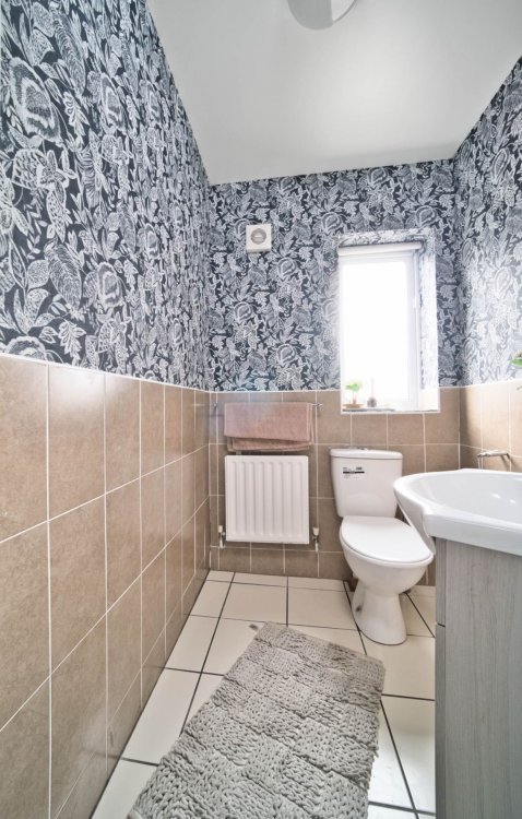 Guest W.C. 1.45m x 1.57m Tiled flooring, semi tiled wall, w.c., w.h.b. with built in vanity unit, light fitting, fitted mirror and extractor fan.
