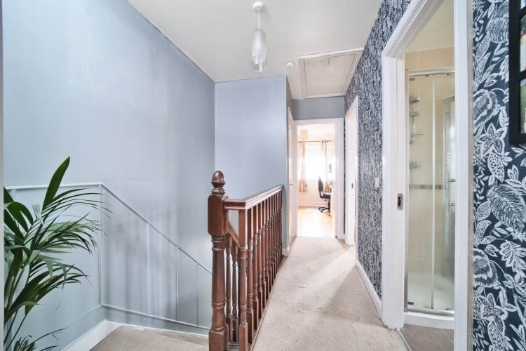 Landing 3.45m x 1.94m Carpet, half panelled walls, hot-press, natural light tunnel and attic access with folding attic ladder.