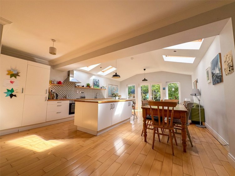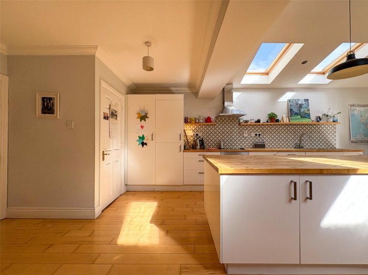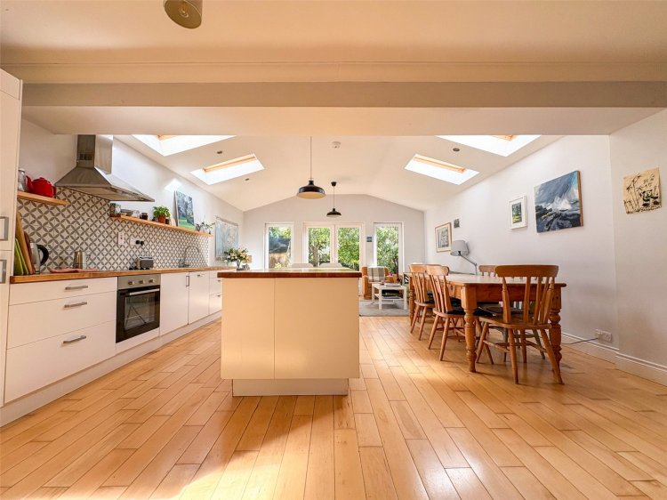 The ground floor is arranged between a large welcoming hall with under-stairs storage, living room with inserted-stove fireplace and a very impressive kitchen-dining room that has been fully extended & modernised with features such as vaulted ceilings with skylights, upgraded kitchen with central island countertop & double doors leading to the private garden. A separate utility space completes the ground floor area.