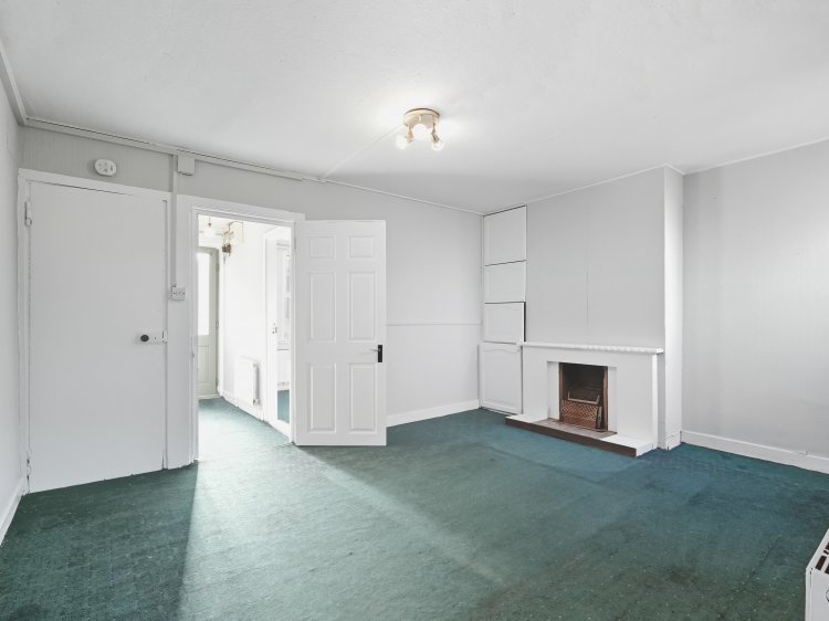 Finished with carpet flooring. This has the remnants of the old fireplace in the corner and this is a bright south-facing room overlooking the front garden. |