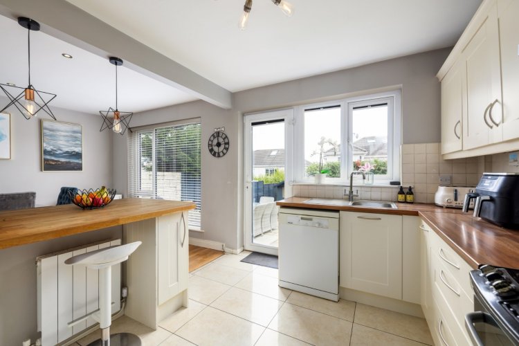 The accommodation comprises a welcoming entrance hall leading to a comfortable sitting room to the front, which flows through to a generous dining area adjoining a contemporary kitchen complete with a breakfast bar and quality fittings. Upstairs there are three bedrooms—two doubles and one single—along with a beautifully appointed main bathroom. The cleverly converted attic offers a superb additional space, ideal for use as a home office, study, or guest room. Outside, the private rear garden features a manicured lawn, raised patio, and fully powered Barna shed, while the front driveway provides off-street parking for two cars.