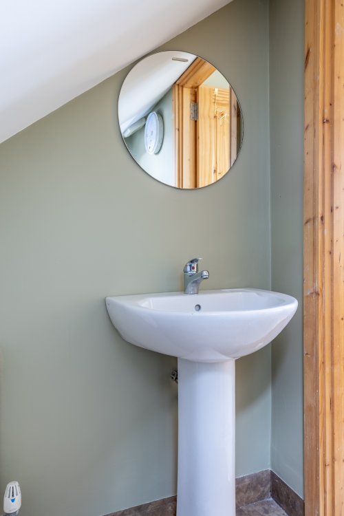 Bathroom (Ground Floor) – 1.72m x 1.77m = 3.04 sqm High ceiling and full tiling, this bathroom includes a shower enclosure with Mira Elite electric shower, wc and whb. A Velux window provides natural light and fresh air, while additional items include a tiled floor, fan heater, extractor fan, radiator and recessed ceiling downlighters.