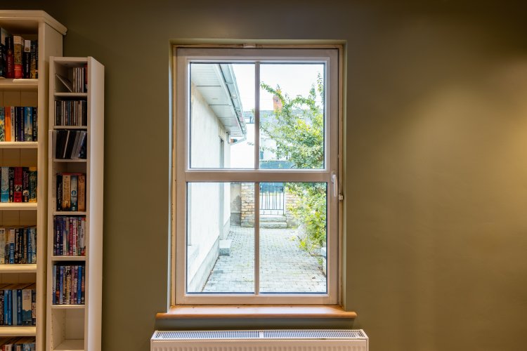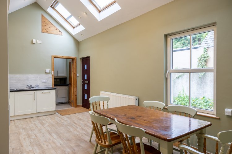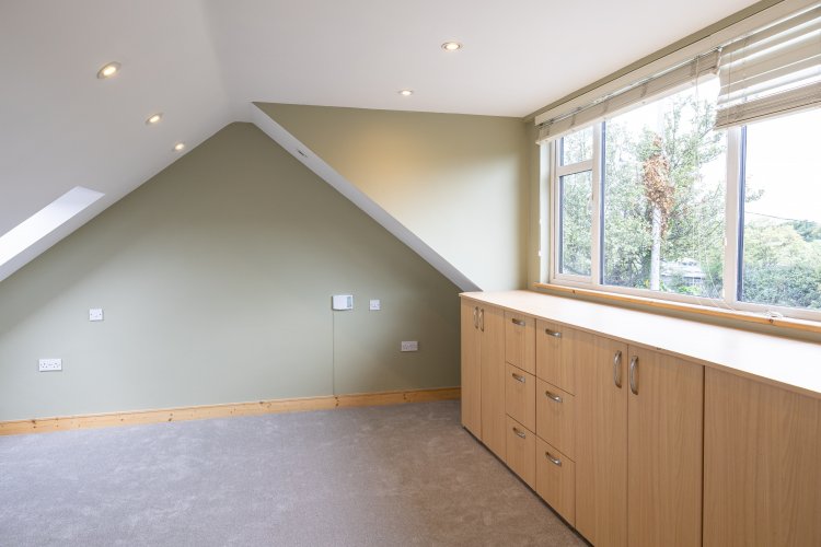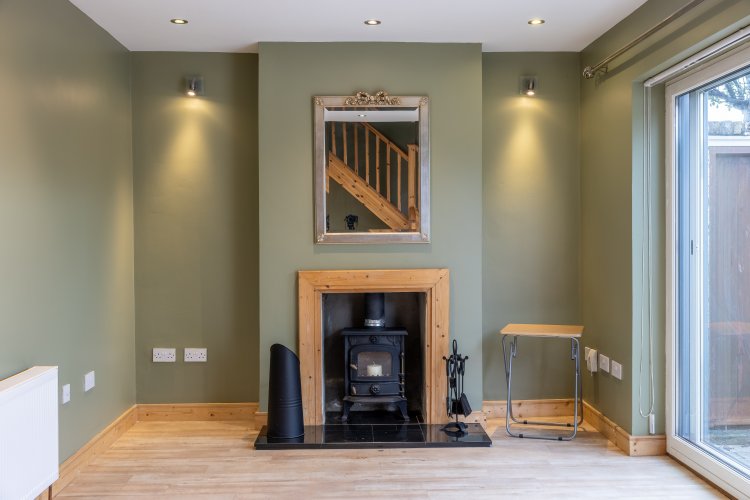 The mood of this home marries old-world charm with modern practicality, and while the layout doesn’t follow the conventions of a standard build, its slightly unconventional nature only adds to its appeal. The ground floor also includes a well-appointed bathroom with shower, completing the downstairs accommodation. The kitchen has been fitted with contemporary-style units, with generous countertop space and a newly tiled splashback adding to the finish, alongside modern appliances. One of the most striking features of the house is the vaulted ceiling, which creates an immediate sense of space on entry. A range of motorised Velux windows in the ceiling floods the room with natural light. The living room is positioned to the rear and forms the heart of the home, where a multi-fuel stove provides a cosy focal point, and large sliding glass doors open directly onto the garden. The original downstairs bedroom, which faces onto the private front path, remains an important part of the home’s layout and is currently used as a versatile living space. With a decorative fireplace providing warmth and bookshelves lined with the current owners’ collection, it offers flexibility to serve as a cosy bedroom, study, or reading room depending on one’s needs.