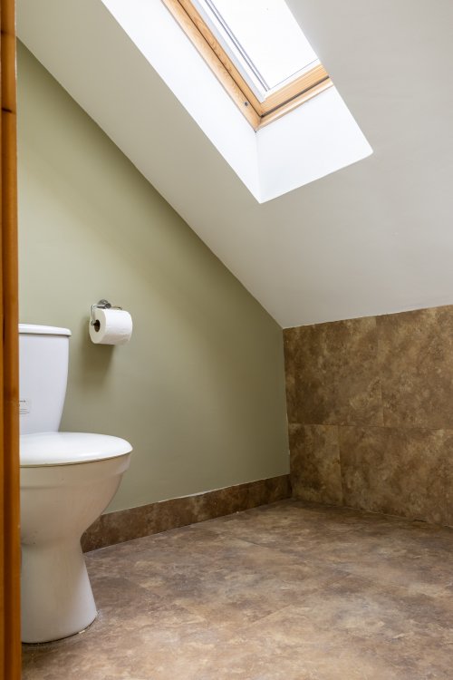 Bathroom (First Floor) – 2.10m x 1.64m = 3.44 sqm This bathroom includes a wc, whb, radiator and Velux window. It is finished with a vinyl floor covering.