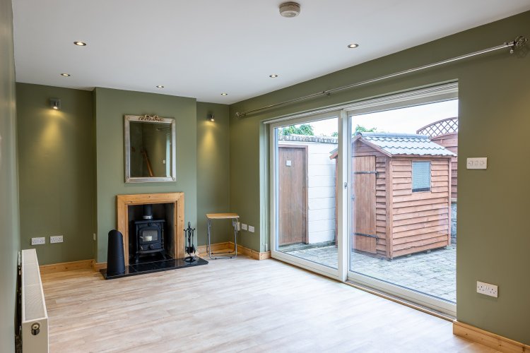 Living Room – 6.10m x 3.17m = 19.34 A spacious and inviting living area with a multi-fuel stove as its focal point. The room also includes a radiator, internet socket, seven power points, downlighters, wall lights, and a smoke alarm. A sliding door with a three-metre glass panel allows natural light to flow in and provides access to the rear. Stairs lead directly from here to the first floor.
