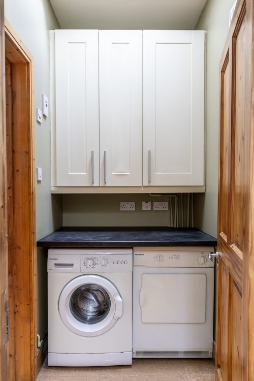 Utility Room – 1.27m x 1.75m = 2.22 sqm This practical utility space houses a washing machine and dryer, with a countertop for convenience. It also accommodates the Vokera gas-fired boiler. A Velux window and tiled floor complement the room, which includes a wall vent and ceiling light.