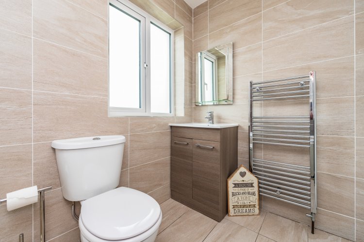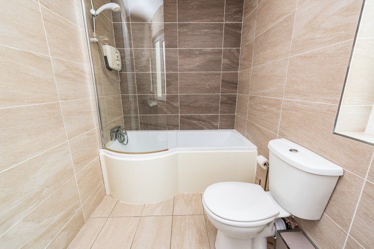 w.c., vanity w.h.b., bath with shower attachment, electric shower over, heated towel rail, fully tiled floor and walls. |
