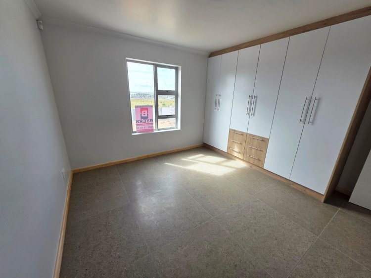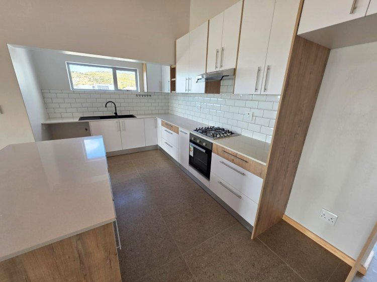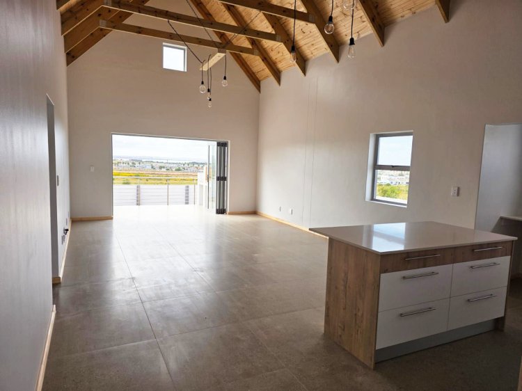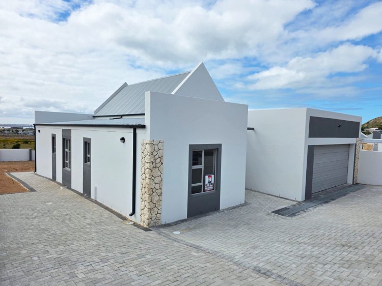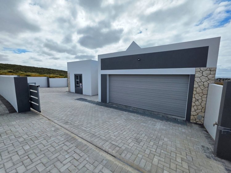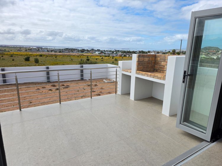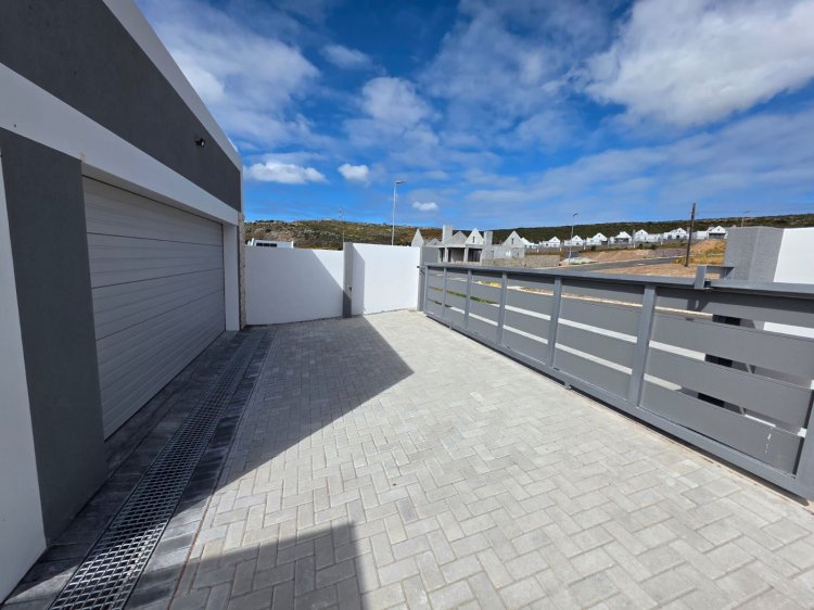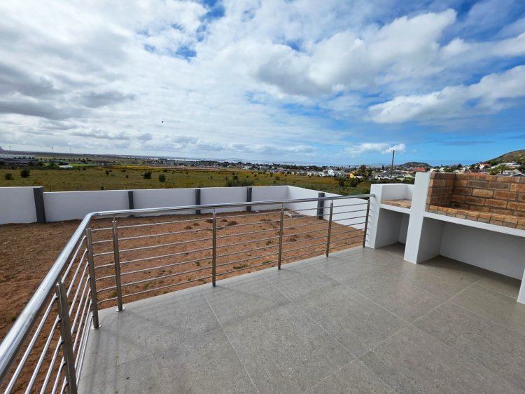 This brand new and master-built home with uninterrupted views towards the bay from well positioned and ideally elevated Welgedaan Estate in Saldanha Heights opens from a secure and gated frontage to a tiled entrance with flow to a spacious and open plan kitchen and living room with trendy exposed trusses with the resultant double volume benefit and feel. The kitchen boasts ample built in cupboards, engineered stone tops, fitted oven/gas hob/extractor fan, convenient breakfast nook and well appointed and tiled "splash-back" finishing. This open plan living area opens via a cascading / stack door to a uncovered braai patio with breathtaking views towards Saldanha Bay, Langebaan in the backdrop and Saldanha harbour. The stairs from the patio leads to the rear and walled back garden area. The 3 bedrooms are also conveniently tiled, offer ample built in cupboards and the master bedroom has a " tiled to top" en-suite bathroom with a shower, toilet and a washbasin (Quality finishes throughout) The " tiled to top" family bathroom is a full bathroom. The automated double garage offers convenient direct access to the house, houses the geyser-wise control panel and geyser and also provides a door to the rear. 2X PVR panels for the Geyser-Wise control and heating system Fibre ready