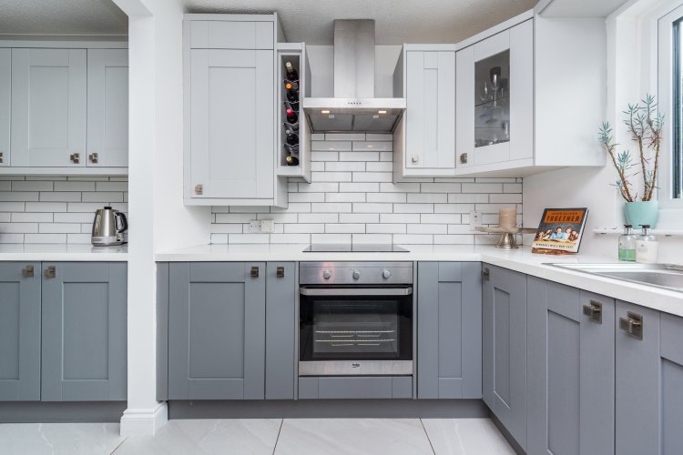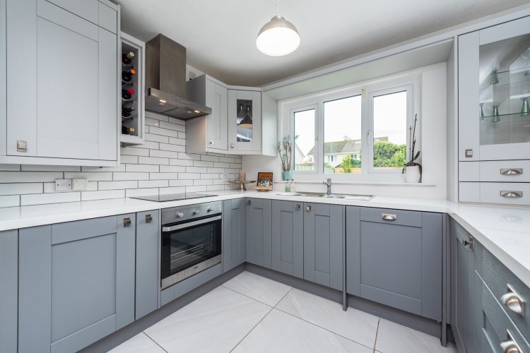 With tiled floor, coving, grey built in ground and eye level units with soft close doors and drawers, stainleess steel sink, Beko integrated dishwasher, Beko electric oven, Beko ceramic hob with extractor, subway tiled splashback, integrated Beko washing machine, integrated beko fridge/freezer, french doors to rear garden. |