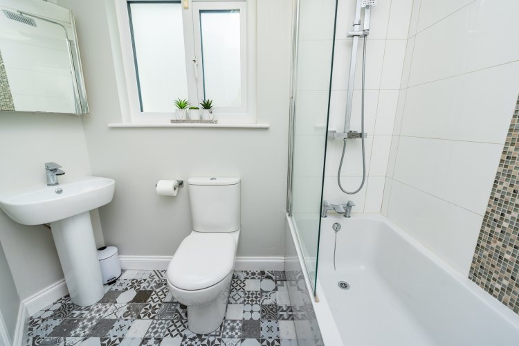 Porcelain tiled floor, w.c., w.h.b with waterfall tap, Mira electric shower, heated towel rail. |