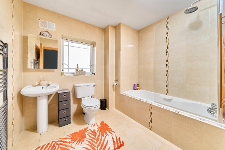 very well-appointed bathroom with tiled flooring & walls, bath with in-bath shower, wc & whb, |
