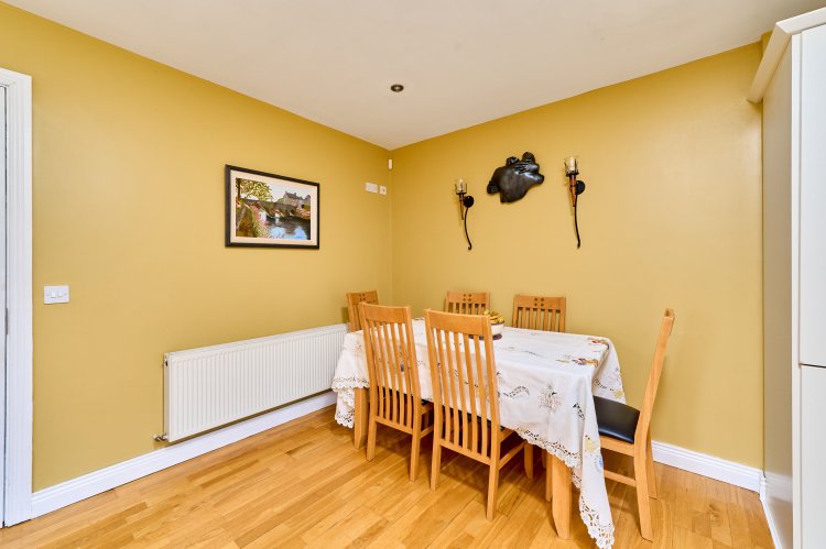 with solid wood T&G flooring in the dining/family area, having patio doors to the decking & rear garden, kitchen area 2.55m x 2.55m with tiled flooring, great fitted kitchen to include double eye-level oven, hob, dish-washer, integrated fridge/freezer & washing machine. |