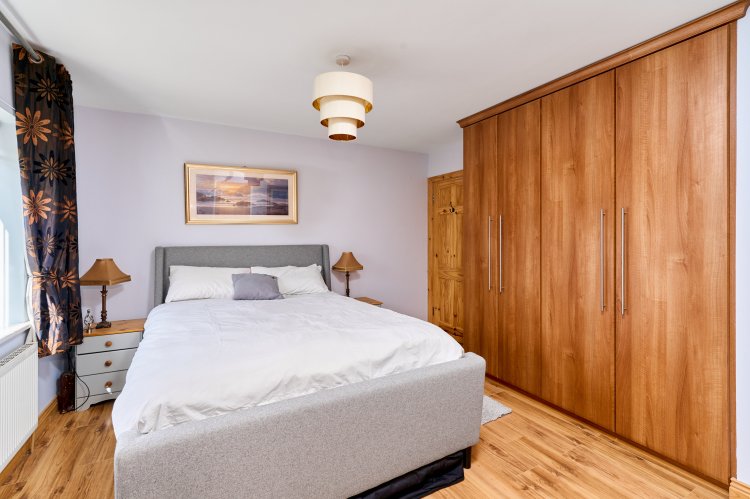 large master bedroom with laminate wood flooring, built-in wardrobes, TV point, curtains & blinds |