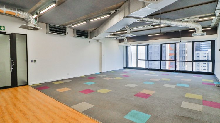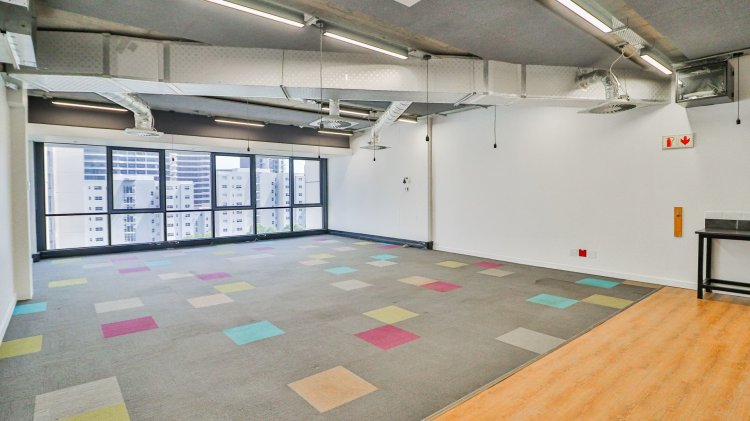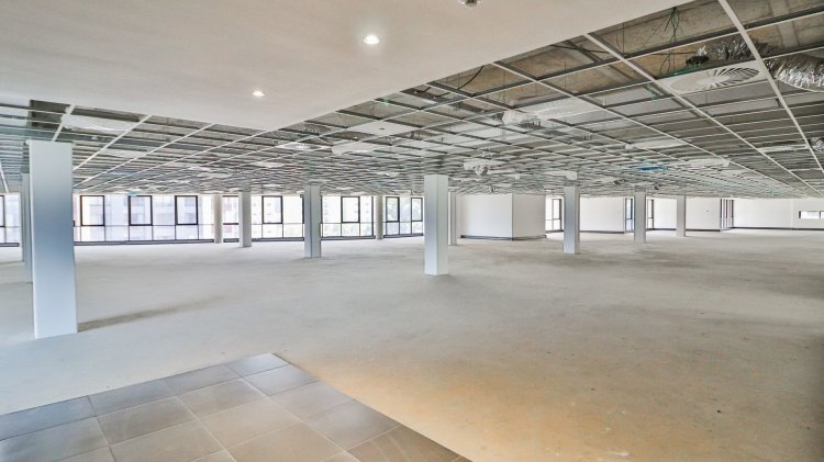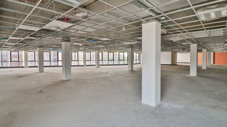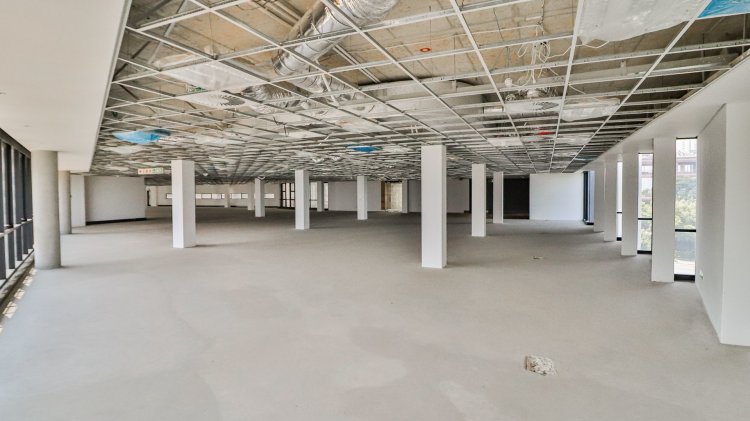 Floors 2, 3, and the remaining part of Level 4 are unfinished, with recessed fluorescent lighting installed but no ceilings or floor finishes. These spaces allow tenants to customize them to their needs.
