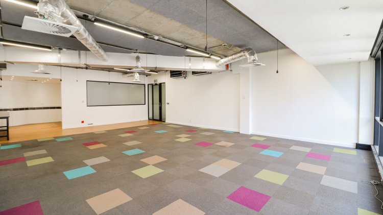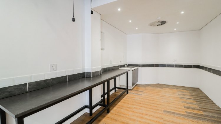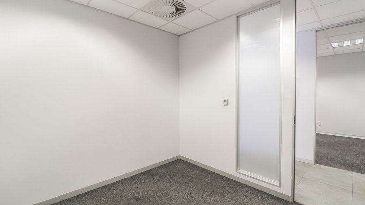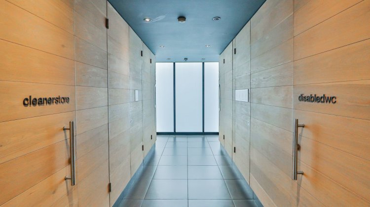The ground-floor offices have a simple, modern look with concrete floors and no suspended ceilings. The shared areas, like hallways, elevator landings, and restrooms, are finished with sturdy quarry tiles.
