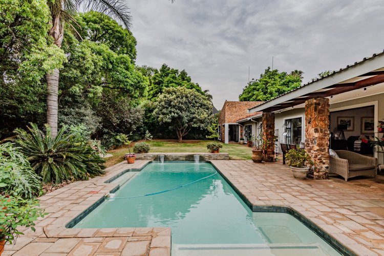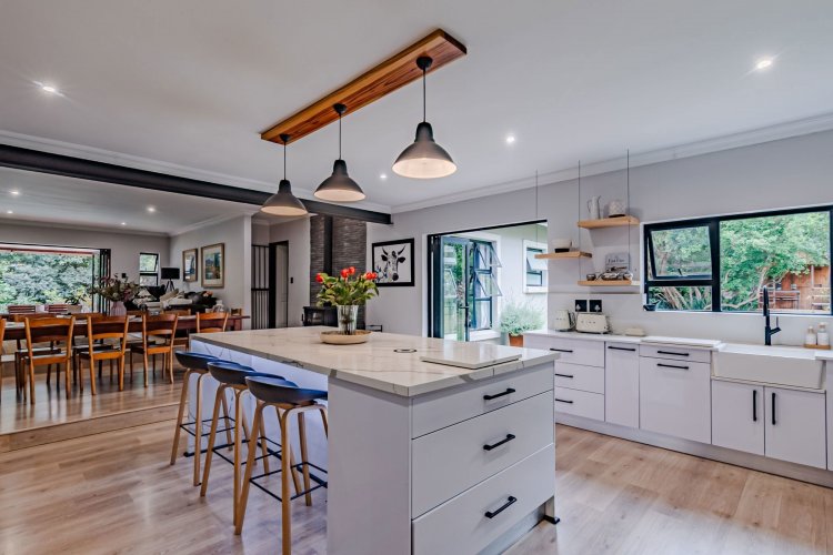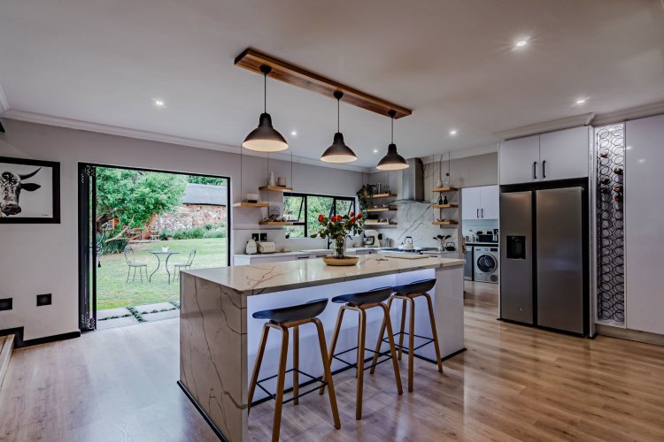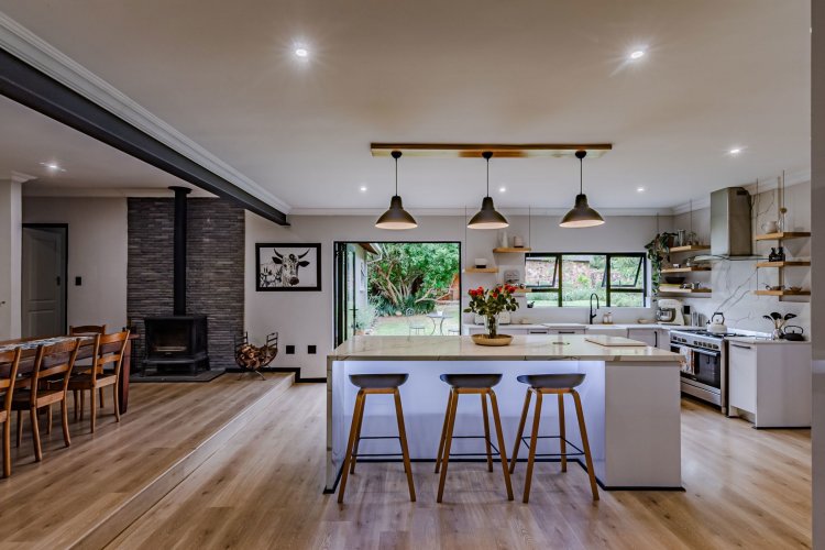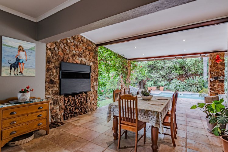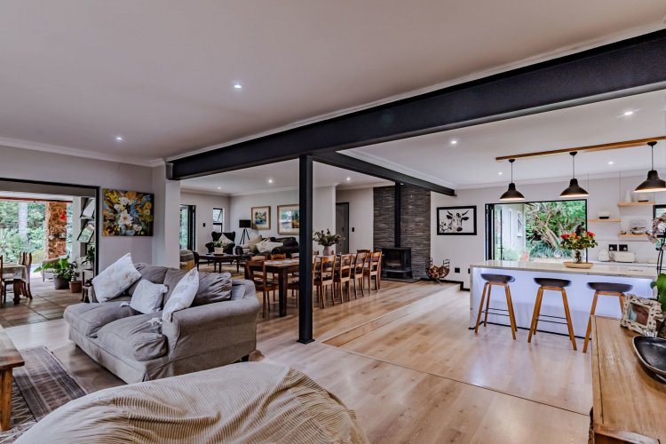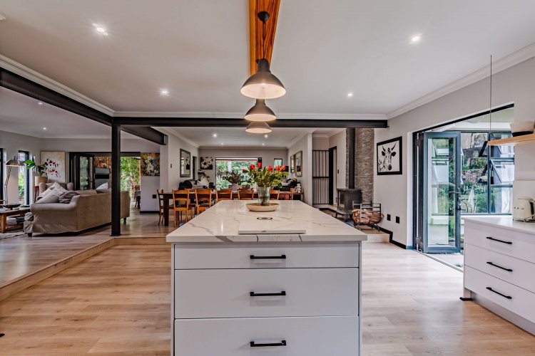 Stacking doors blur the lines between indoors and outdoors, opening onto an inviting undercover patio complete with a built-in braai, perfect for year-round entertaining. From here, the garden unfolds around a sparkling swimming pool, while a dedicated boma area with built-in seating provides an idyllic setting for gatherings under the stars.