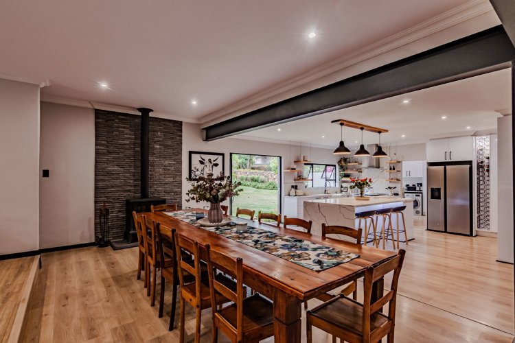 The home welcomes you with a sense of space and flow, where open-plan design creates a seamless connection between the living areas. The heart of the home is the gorgeous kitchen, perfectly appointed with contemporary cabinetry and ample counter space, lovely walk-in pantry and scullery/laundry, designed to bring family and friends together. Adjacent to the kitchen, the dining area and TV lounge are centred around a characterful wood fireplace, creating a cosy atmosphere for winter evenings.
