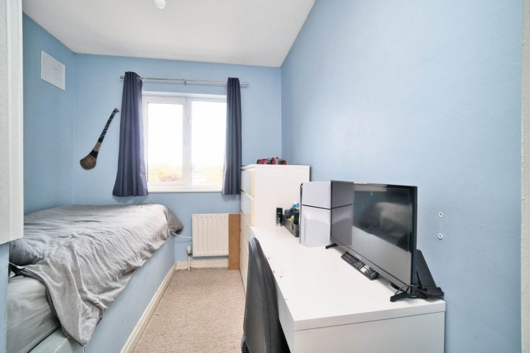 Bedroom 3 3.2m x 2.4m Carpet, curtains, fitted wardrobe and light fitting.