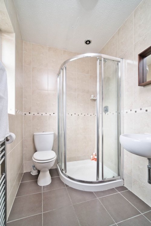 Ensuite 1.9m x 1.53m Fully tiled, shower cubicle, w.c., w.h.b., heated towel rail, recessed lights and window.