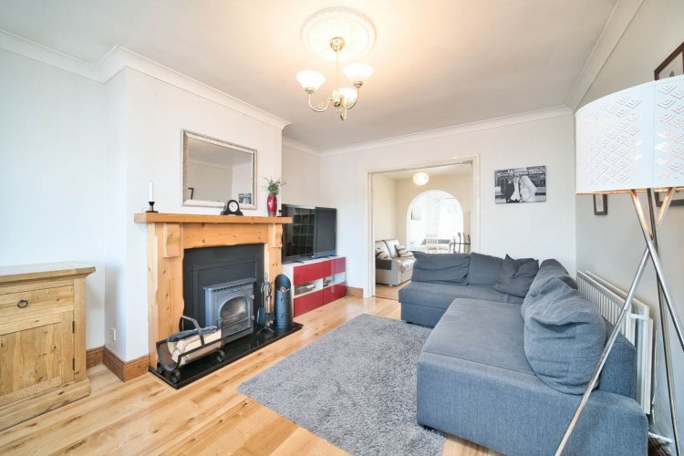 Living Room 3.57m x 5.12m Wood flooring, feature fireplace with granite hearth, wood surround and solid fuel stove, TV point, coving, light fitting and double doors leading into family room.