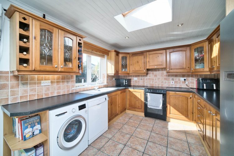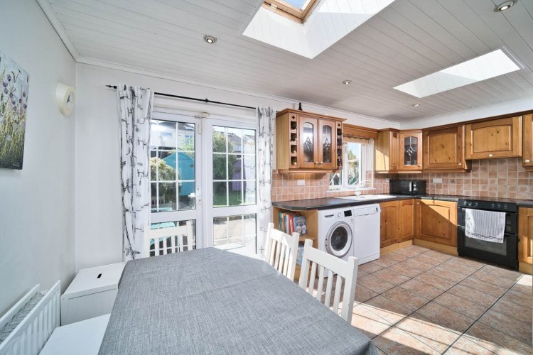 Kitchen/Dining 3.48m x 5.38m Tiled flooring, fitted wall and floor units, tiled splashback, wine rack, electric oven, extractor fan, dishwasher, wood panelled ceiling, recessed lights, sky light and double doors leading out to garden.