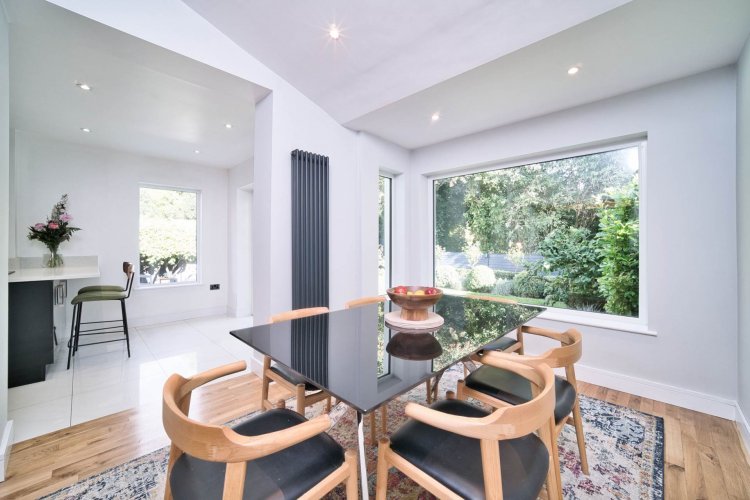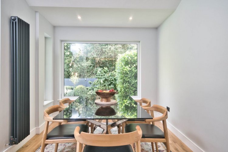 Dining 3.45m x 3.00m Recent extension, Junkers solid oak wooden floor, dimming spotlights, dual aspect windows, large window 2m x 1.5m overlooking manicured back garden, anthracite grey vertical radiators and raised ceiling height.