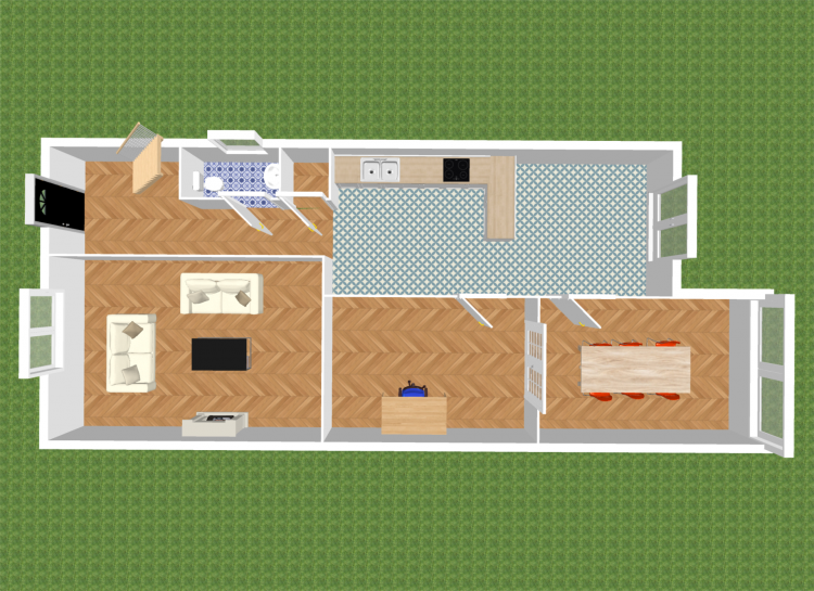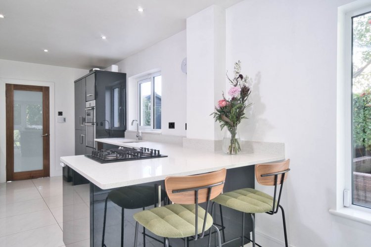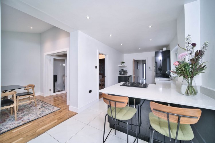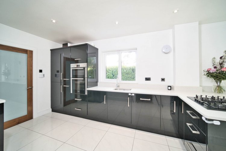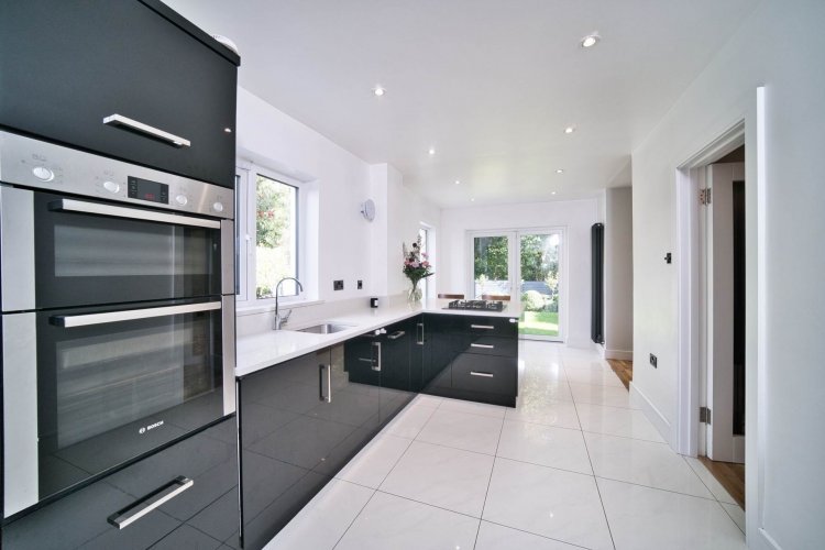 Kitchen 6.70m x 2.70m Tiled floors, modern high gloss kitchen, Bosch gas hob, Bosch fridge freezer, Bosch double oven, spot lights, quartz counter tops, French doors leading to garden, open plan dining room and anthracite grey vertical radiators.