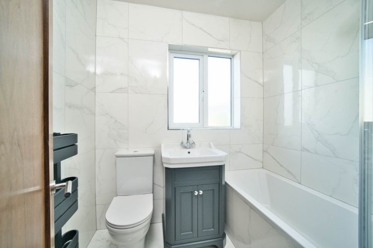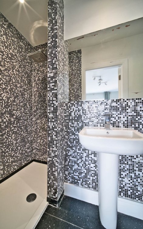 Bathroom 1.65m x 2m Wall and floor tiling, built in shelves, toiletries cabinet under wash hand basin, WC and bath with shower.