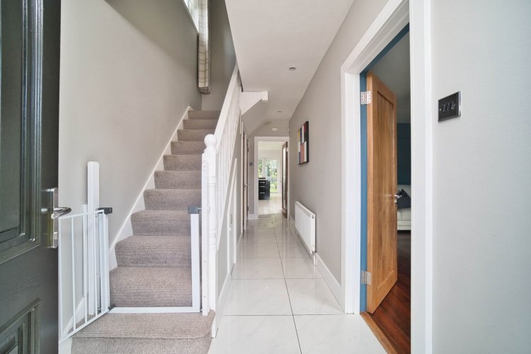 Entrance Hallway Porcelain tiled floor, under stairs storage, boiler room and Denta Solid Walnut veneer doors.