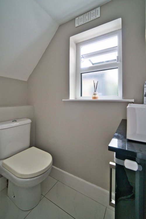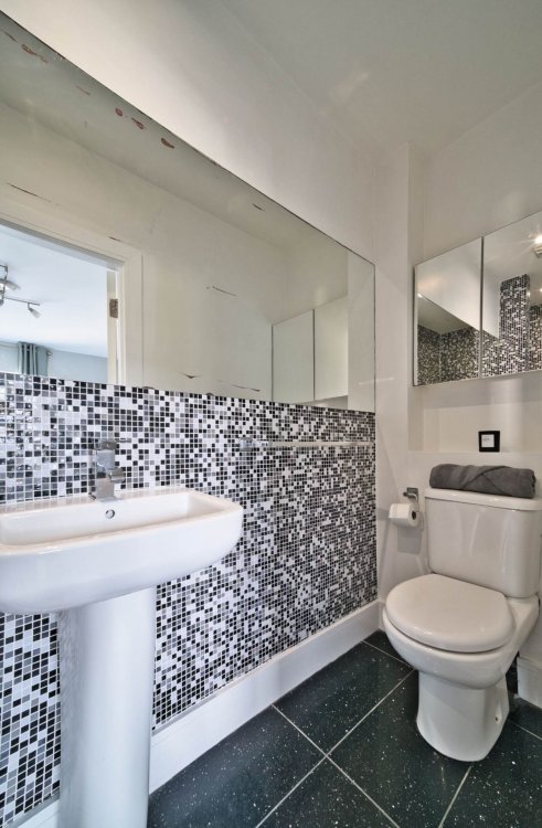 Guest W.C. Light fitting, WC, wash hand basin, porcelain tiled floor and toiletries cabinet.