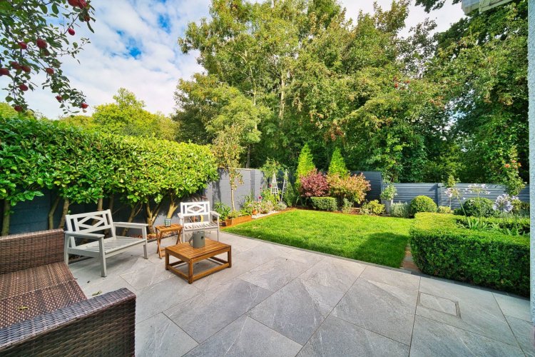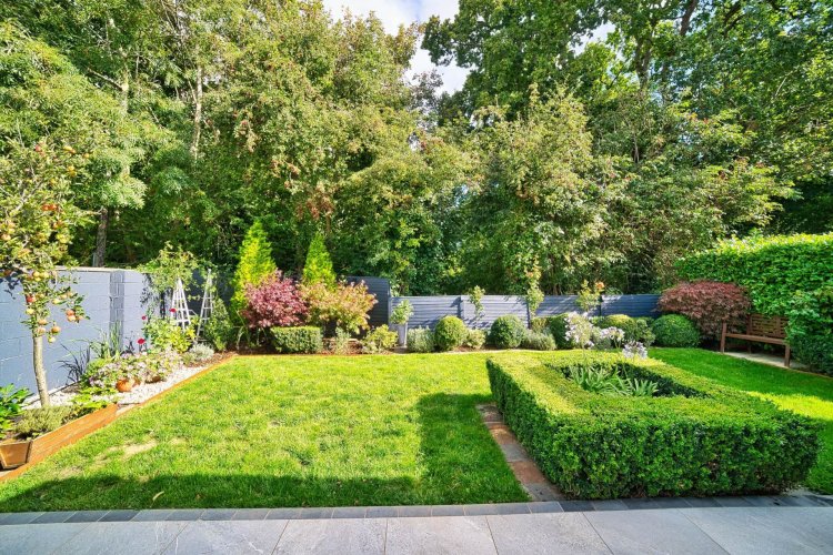 Garden Sunny drenched side and rear garden, not overlooked with fully landscaped porcelain patio area (9.5m x 5.3m), outdoor flood lighting and extensive mature planting.