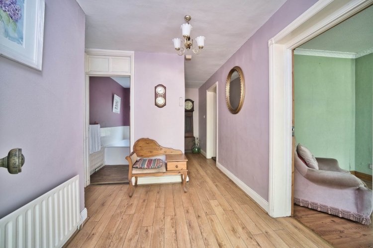 Entrance Hallway (2.53m x 2.21m) + (2.81 x 0.92m) + ( 5.3m x 0.86m) Laminate wood flooring, light fitting, hot-press (2.4m x 1.12m).