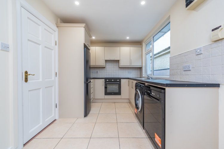 With tiled flooring, built-in ground and eye level units, plumbed, gas hob, stainless steel sink, tiled surround, extractor, recess lighting. |