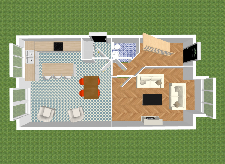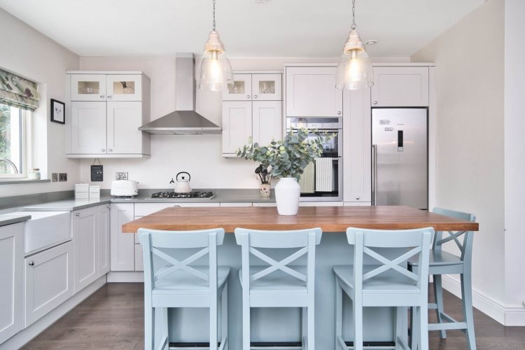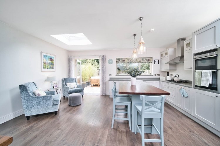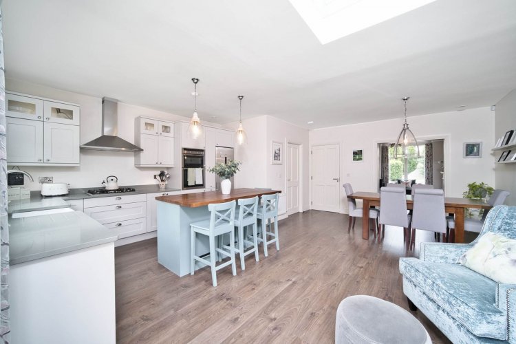 Kitchen/Dining 6.6m x 5.48m Laminate wood flooring, fitted shaker style wall and floor units, quartz worktop with upstand, Island with breakfast bar, storage and solid oak worktop, Belfast sink, Neff gas hob, Neff double oven, integrated dishwasher, Siemens fridge freezer, light fittings, roman blinds and French doors leading out to rear garden.