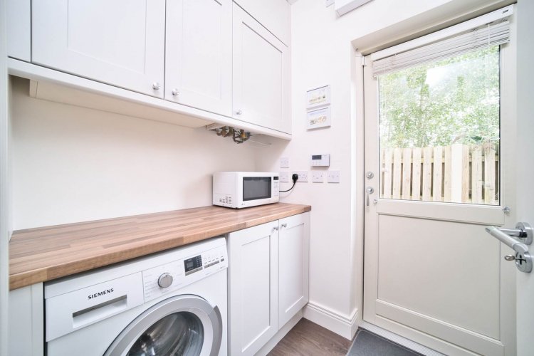 Utility Room 1.5m x 1.78m Laminate wood flooring, storage units, fully plumbed, door leading to side and houses gas boiler.