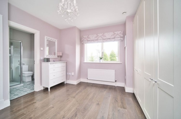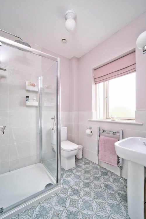 Ensuite 1.96m x 1.84m Tiled flooring, semi tiled walls, shower cubicle with monsoon shower head, w.c., w.h.b., vertical heated towel rail, extractor fan, fitted mirror with lighting, roman blind and light fitting.