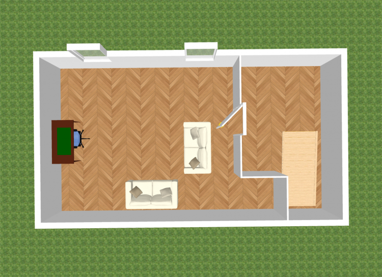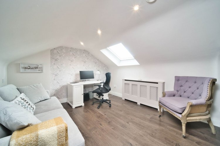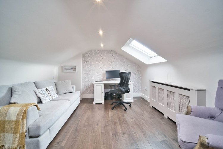 Attic Room 5.57m x 3.46m Landing area with book shelf, storage and light fitting. Large room with laminate flooring, Velux window, recessed lights and radiator cover. Access to eaves storage space.
